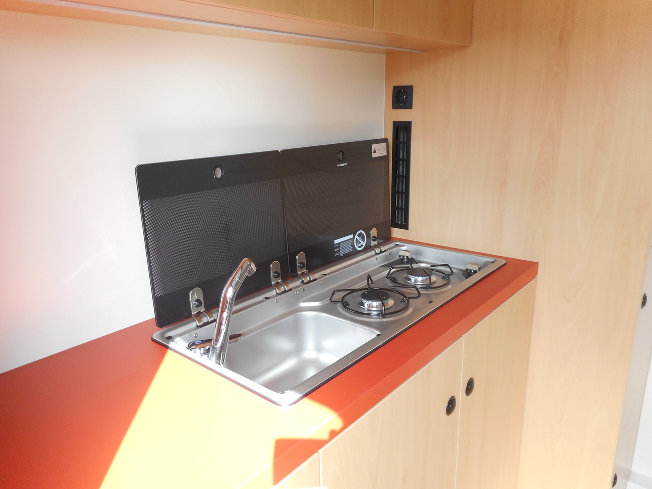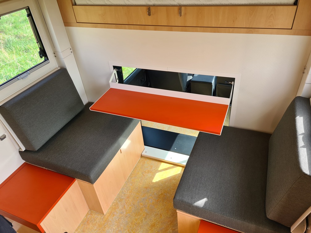 We use our 30 mm honeycomb panels for the insulation walls, which are specially developed by Twiga and extremely lightweight. The elevating roof including awning fabric is fully raisable by means of 4 electric cylinders with a huge lifting capacity.