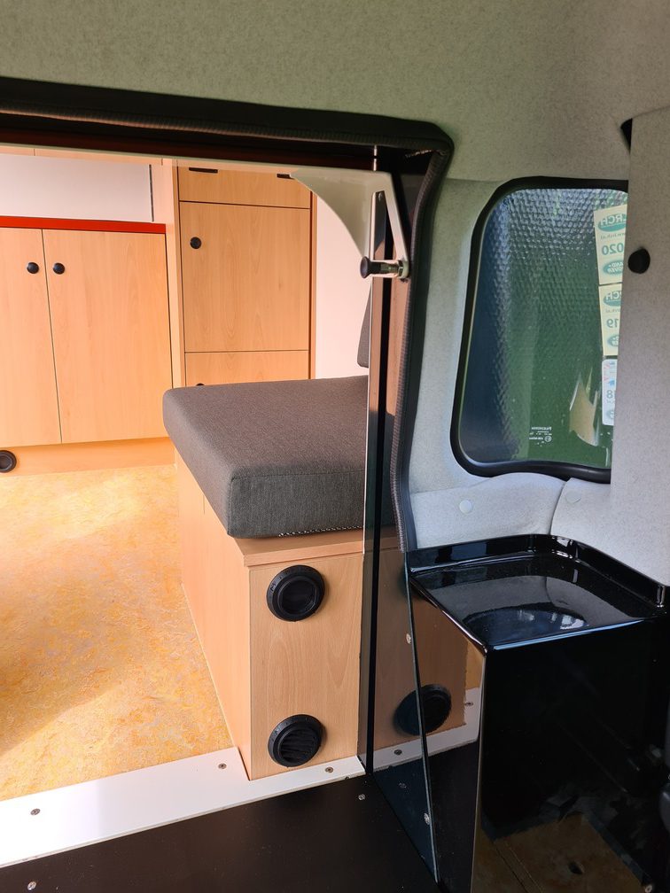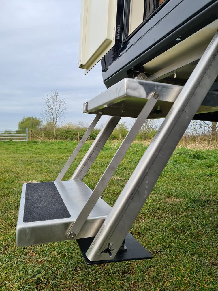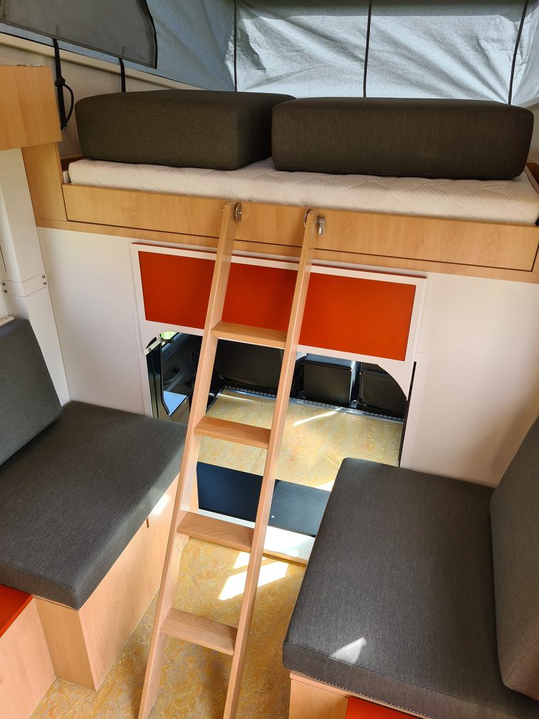 At the client’s request, a living unit was developed, equipped with, windows, Victron electrical installation incl. solar panels, 100-litre fresh water tank, filters, 2 kW heater with air heating, refrigerator, hob, toilet and a functional staircase on the side. Twiga now has a wide collection of staircases of its own design.