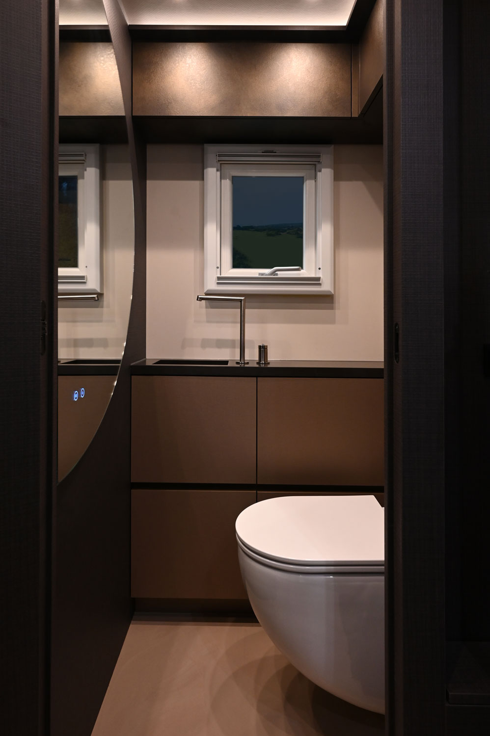 Exterior: Twiga’s well-known aluminum frame, 60 mm panels for the highest insulation values, 4-point suspended subframe. At the rear of the camper unit, a hydraulic lifting system is integrated for the spare wheels and the motorcycle. The exterior also features roof rails with spotlights, as well as storage boxes. Twiga builds to measure and according to your wishes.